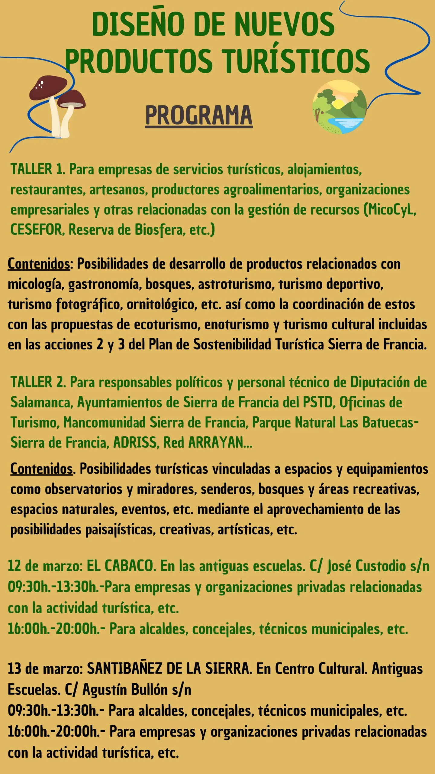 Estos talleres explorarán las oportunidades que ofrece la Sierra Francia y brindará herramientas prácticas para identificar y desarrollar nuevos productos turísticos. Desde la conceptualización hasta la implementación, los participantes adquirirán conocimientos esenciales para destacar en la creación de experiencias turísticas auténticas y atractivas. Dirigido tanto a empresas turísticas como a empleados del sector público, estos talleres se centrarán en la importancia de la colaboración estratégica para el éxito de los nuevos productos turísticos. Se abordarán temas como la coordinación entre sectores, el desarrollo sostenible y la promoción efectiva del destino.
