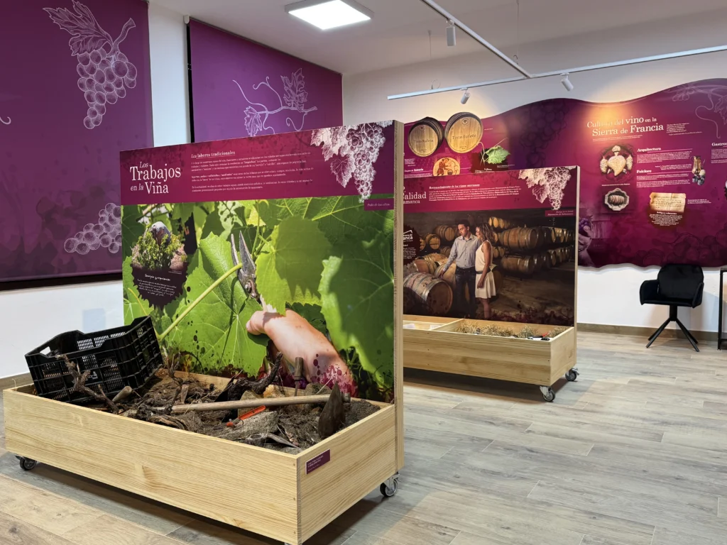 Cuatro grandes cajas ubicadas en el centro de la sala te mostrarán información y elementos sobre los viñedos serranos, los trabajos que se realizaban en ellos, los distintos oficios relacionados con el vino y la Denominación de Origen Protegida Sierra de Salamanca, con la cual se ha recompensado la labor de los viticultores serranos reconociendo la gran calidad de sus vinos.