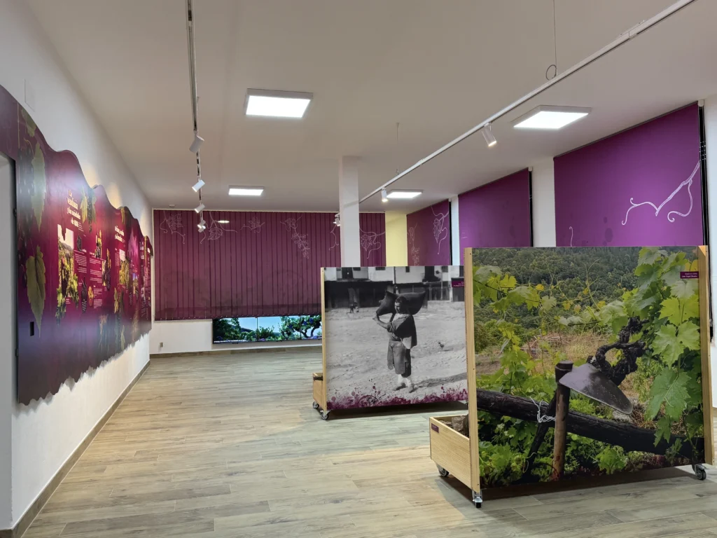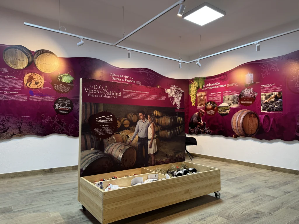 Un vinilo de gran tamaño cubre las paredes del espacio con información y fotografías junto con elementos etnográficos reales. A través de esto, adquirirás conocimientos sobre el proceso de cultivo de la vid en bancales, el clima y los suelos que hacen únicos a los vinos serranos, la vendimia, las diversas variedades de uva, la elaboración de vinos a lo largo de los siglos y la cultura generada a su alrededor, así como el pasado, presente y futuro de la producción de este tesoro en la comarca.