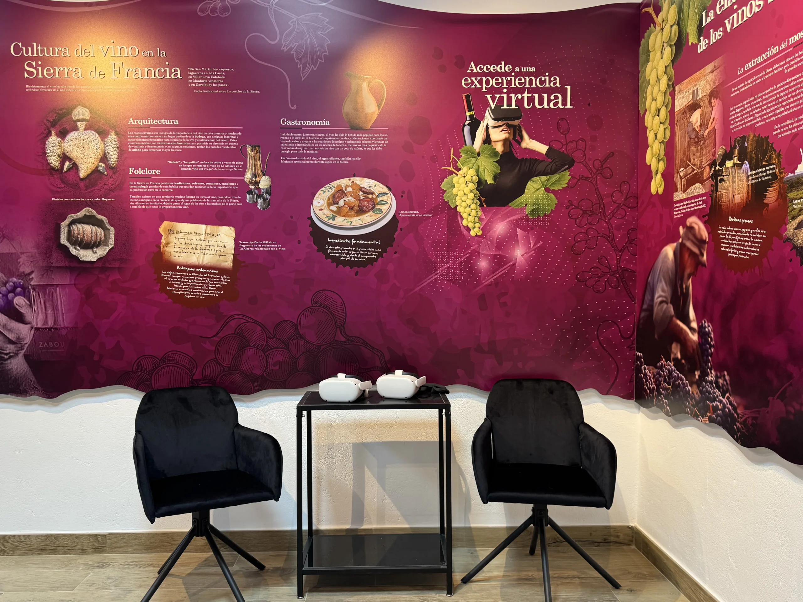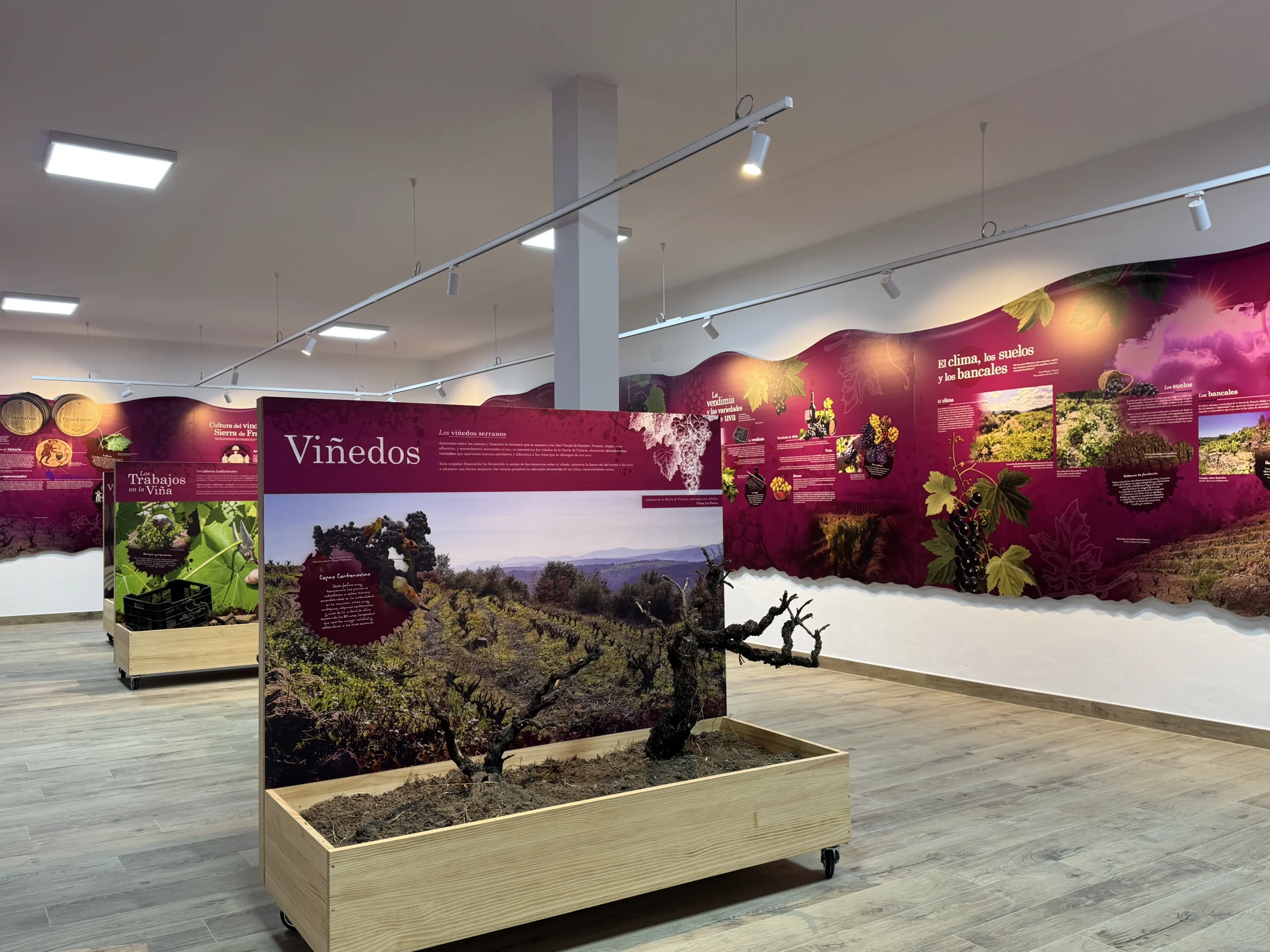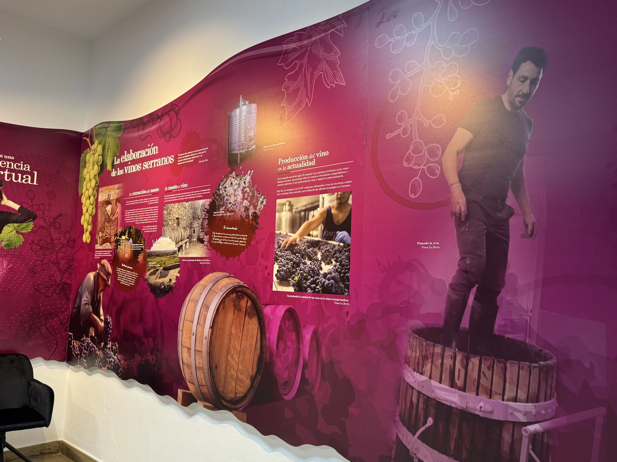 Un vinilo de gran tamaño cubre las paredes del espacio con información y fotografías junto con elementos etnográficos reales. A través de esto, adquirirás conocimientos sobre el proceso de cultivo de la vid en bancales, el clima y los suelos que hacen únicos a los vinos serranos, la vendimia, las diversas variedades de uva, la elaboración de vinos a lo largo de los siglos y la cultura generada a su alrededor, así como el pasado, presente y futuro de la producción de este tesoro en la comarca.