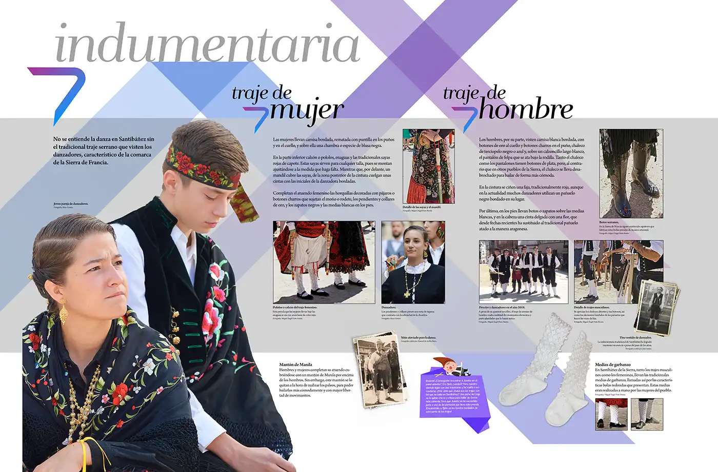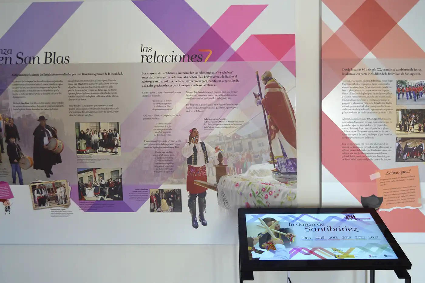 Descubre la riqueza cultural de Santibáñez de la Sierra a través de sus paneles interpretativos de forma didáctica, que te guiarán por un viaje visual a los orígenes de su danza única con fotografías de gran calidad, mostrando los remotos orígenes de estos singulares bailes, la rica indumentaria serrana que portan los danzadores, los distintos paleos y el ramo, así como los personajes que los ejecutan, los instrumentos y elementos que emplean, las costumbres que esta tradición lleva aparejadas, o el esfuerzo de todo el pueblo de Santibáñez de la Sierra por recuperar una danza que se ha convertido en su seña de identidad y en uno de sus mejores embajadores.
