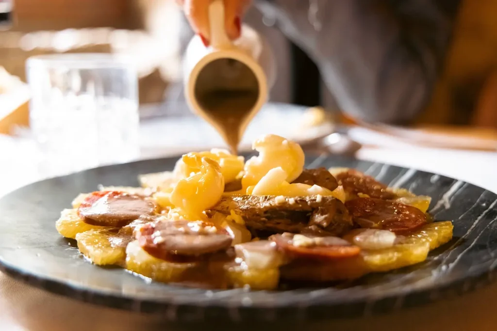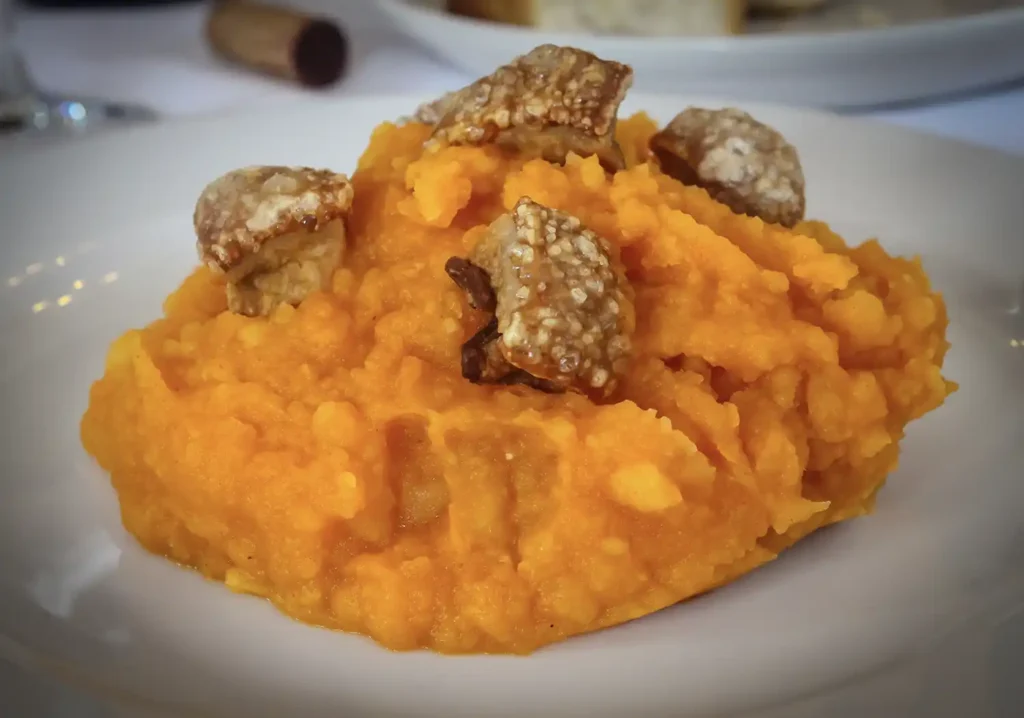 Un plato que constata a la perfección, que las recetas elaboradas con ingredientes humildes pueden convertirse en verdaderas delicatessen. Cocinadas de forma muy lenta y trabajadas a mano, con paciencia y esmero hasta obtener una crema espesa que envuelve y acaricia el paladar, gracias al aderezo compuesto por ajo, pimentón, comino y la propia esencia de los torreznos, que se servirán al final como complemento, crujientes y plenos de sabor.